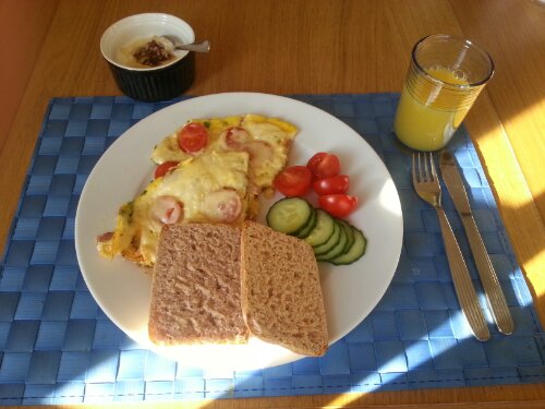 Frokost med omelett, smakfulle små tomatar og rundstykke av spelt med ferskpressa appelsinjuice til – og yoghurt med valnøter og akasiehonning. Og sjølvsagt kaffe til.