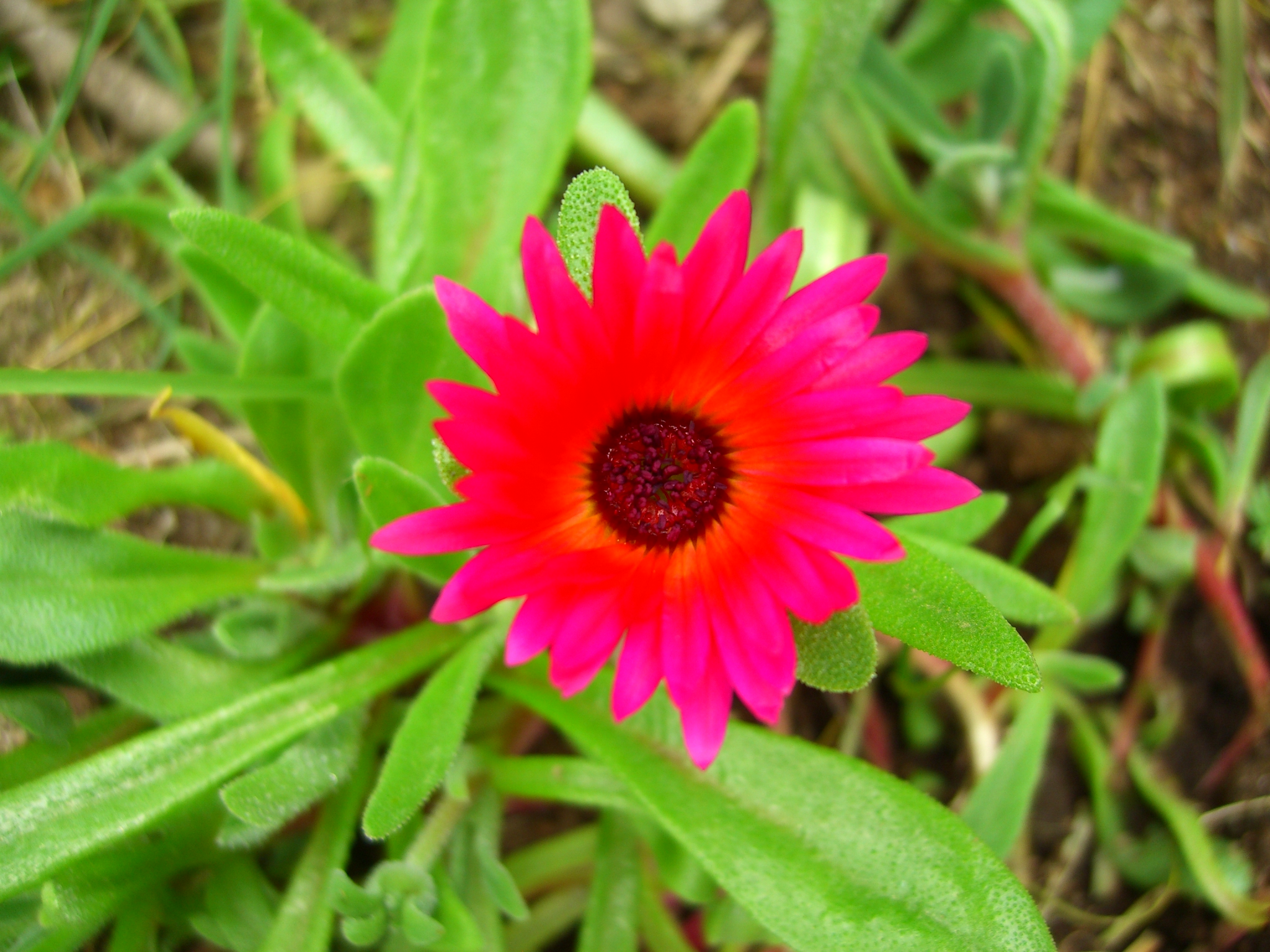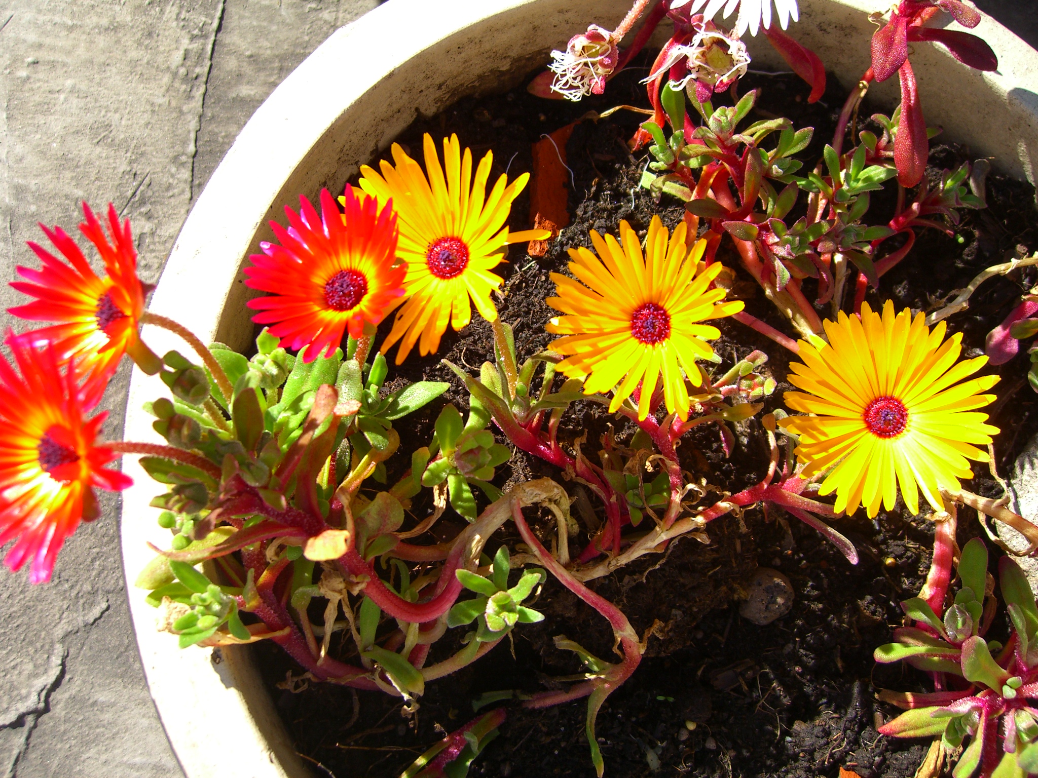 nesten som i hagen hjå bestemor…. Ser nesten kunstig ut med sine skarpe farger og «sukker» på blada. Men viser at den er levande med å berre vise blomsterfargene når det er sol.